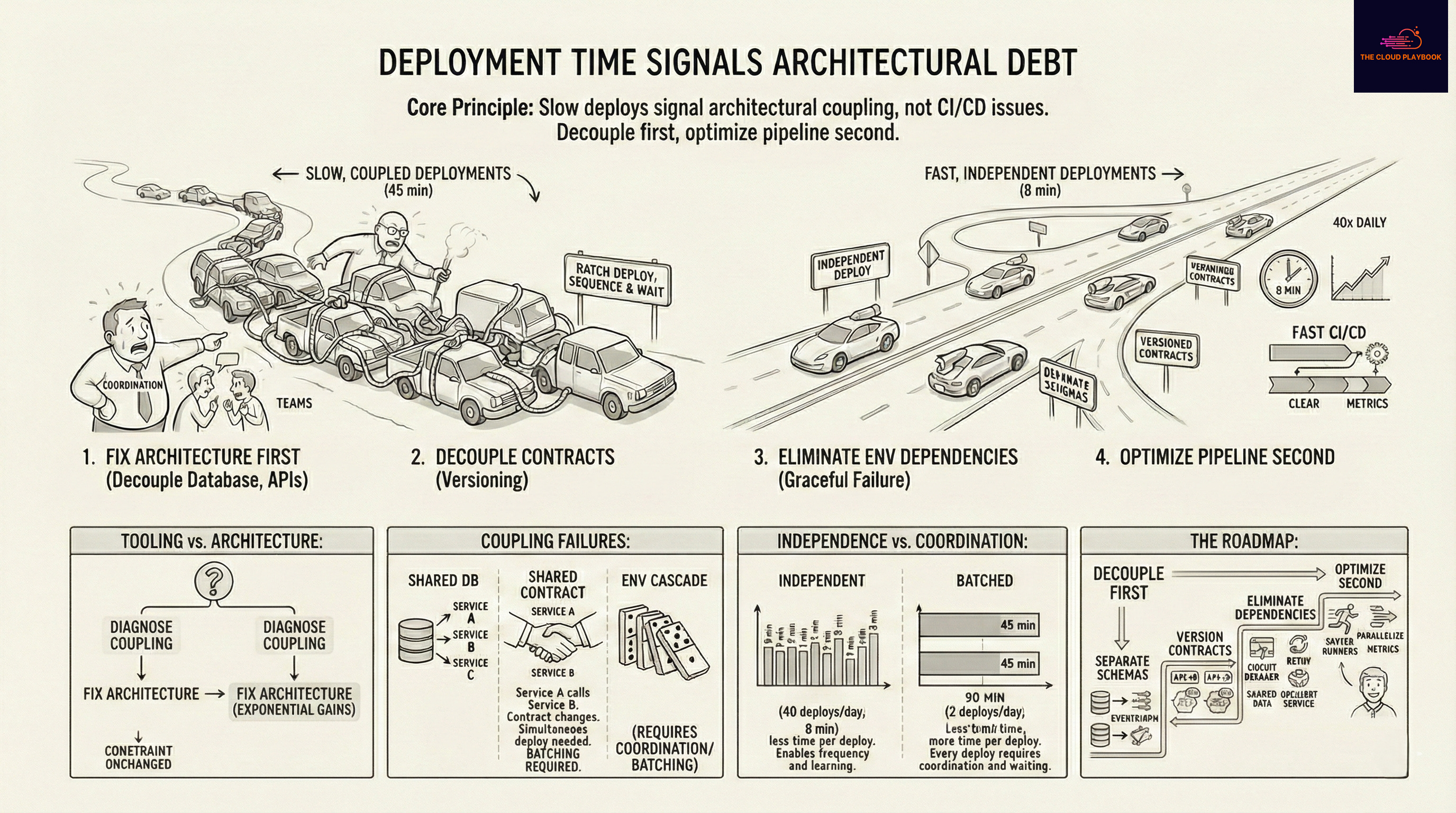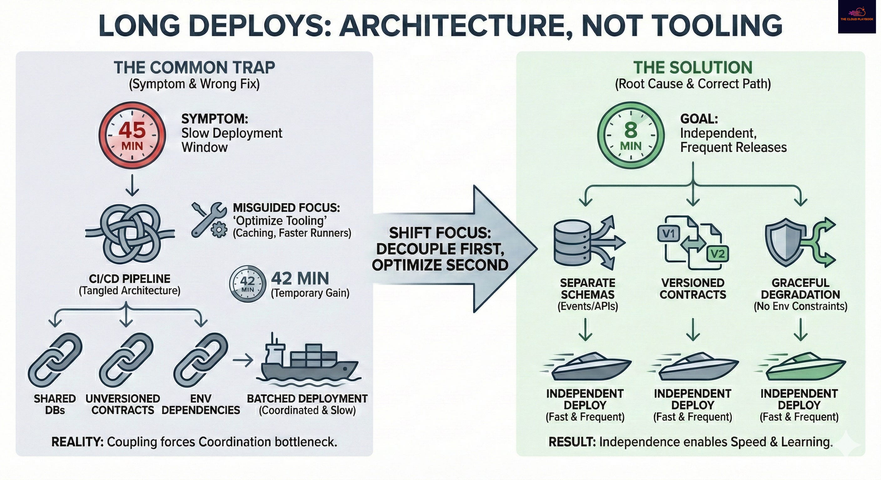 The 45-minute deploy is not a CI/CD problem. It is an architectural coupling problem that manifests at the deployment boundary.
