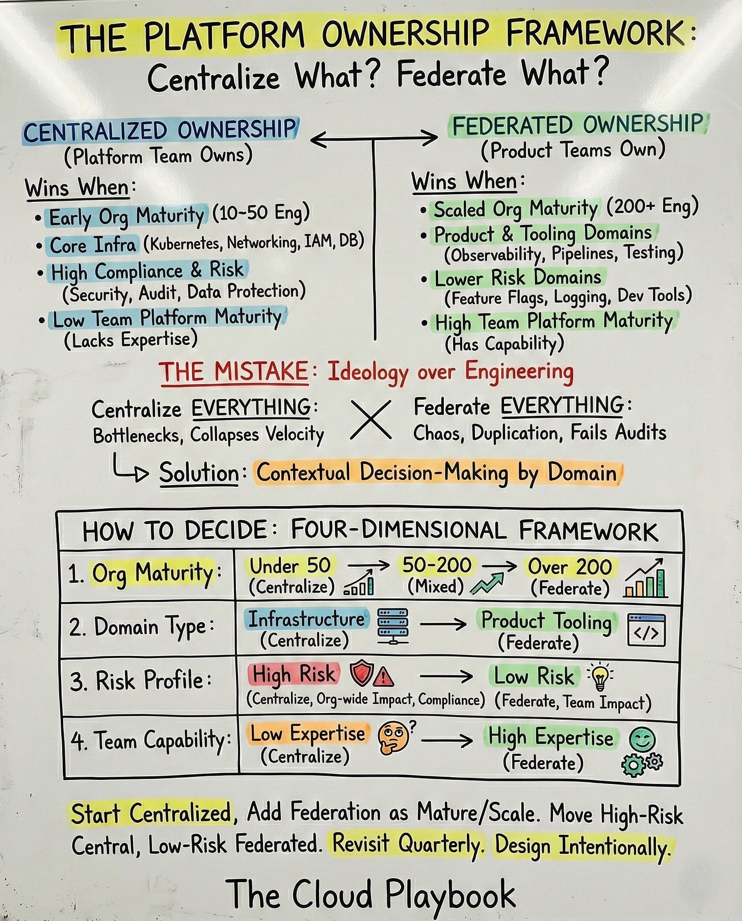 Platform teams face a structural decision. Centralize ownership in a dedicated platform team or federate ownership across product teams.
