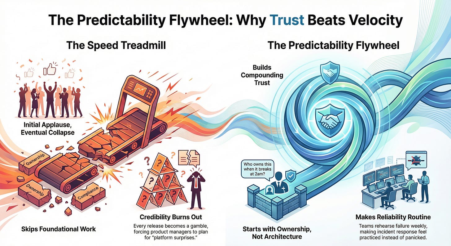 Predictability is a flywheel. Speed without predictability is a treadmill.