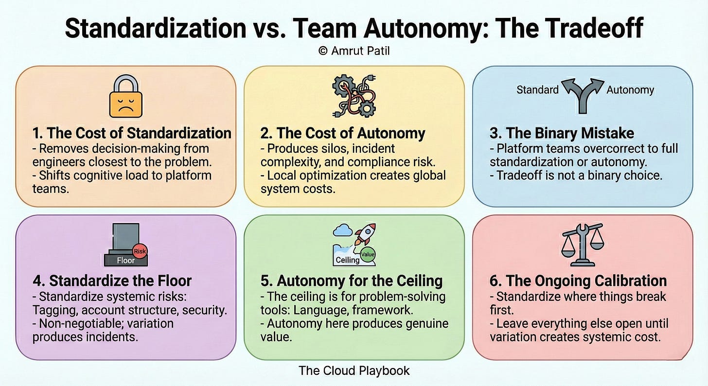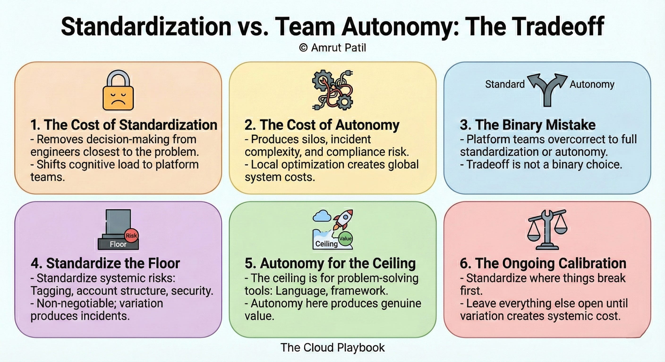 If variation in this layer creates on-call complexity, compliance gaps, or cost-assignment issues, standardize it. The cost of enforcement is lower than the cost of the failure mode.